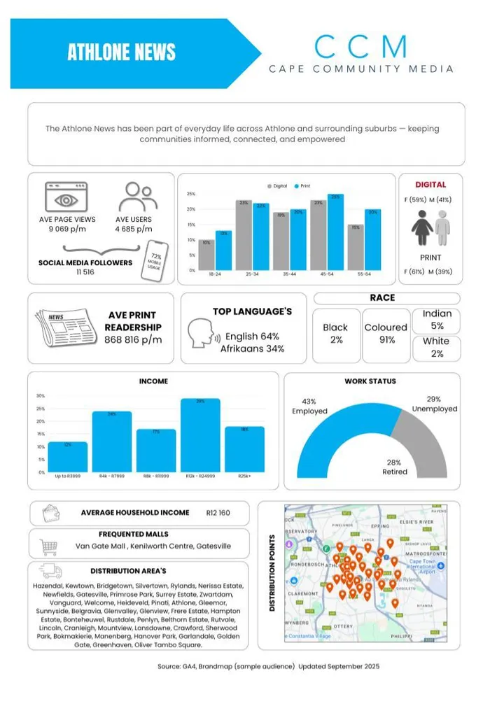 The Athlone News is a free weekly community newspaper available in print and digital format, and is distributed to 56 087 readers’ homes every Wednesday in the Hazendal, Kewtown, Bridgetown, Silvertown, Rylands, Nerisso Estate, Newfields, Gatesville, Primrose Park, Surrey Estate, Zwartdom, Vanguard, Welcome, Heideveld, Pinati, Athlone, Gleemoor, Sunnyside, Belgravia, Glenvalley, Glenview, Frere Estate, Hampton Estate, Bonteheuwel, Rustdale, Penlyn, Belthorn Estate, Rutvale, Lincoln, Cranleigh, Mountview, Lansdowne, Crawford, Sherwood Park, Bokmakierie, Manenberg, Hanover Park, Garlandale, Golden Gate, Greenhaven and Oliver Tambo Square areas.