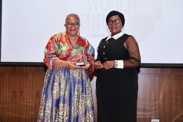 Caroline Peters, Founder and Executive Director of the Callas Foundation, was handed her award by Professor Thuli Madonsela, former public protector and Law Trust Chair in Social Justice, at the Santam Women of the Future Awards.