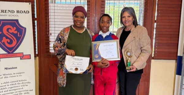 From left are Sonderend Primary School teacher Jesse Brown, Kaylen Ephraim, and principal Maylene Hattingh.