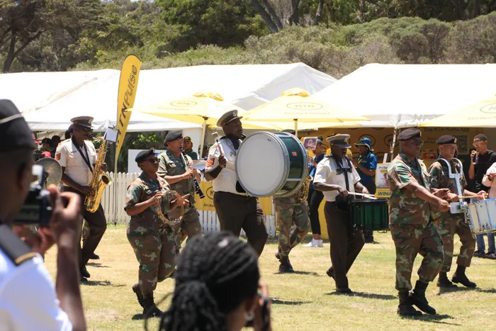 Members of the SANDF's military band announce their arrival at the weekend's festival at Westridge Gardens.