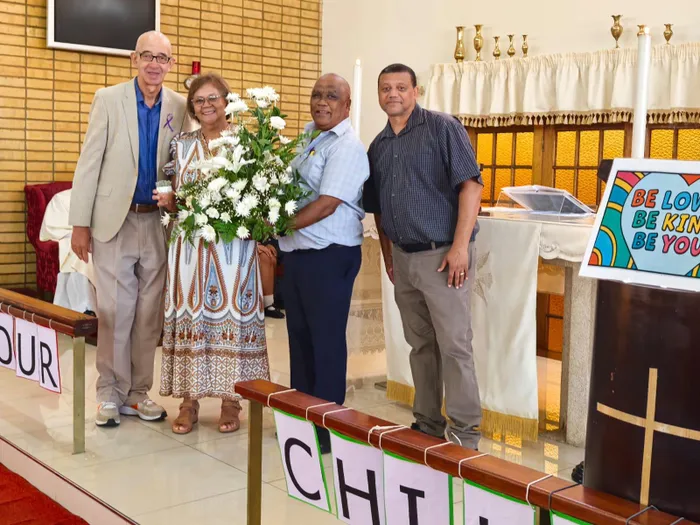 From left, Reading and Writing Solutions NPO chief Jeff and his wife Dawn Paulse were honoured by church committee members Steven Adriaanse and Marius Meyer.
