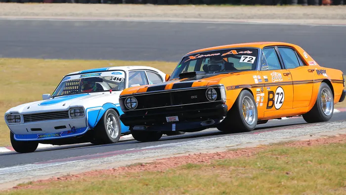 Boetie van Zyl (72) in his Ford Fairmont GT and Jarryd Evans in his Ford Capri fight for the lead in the classic car race, at Killarney, on Saturday.